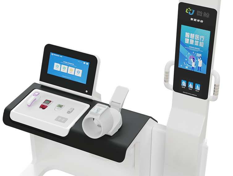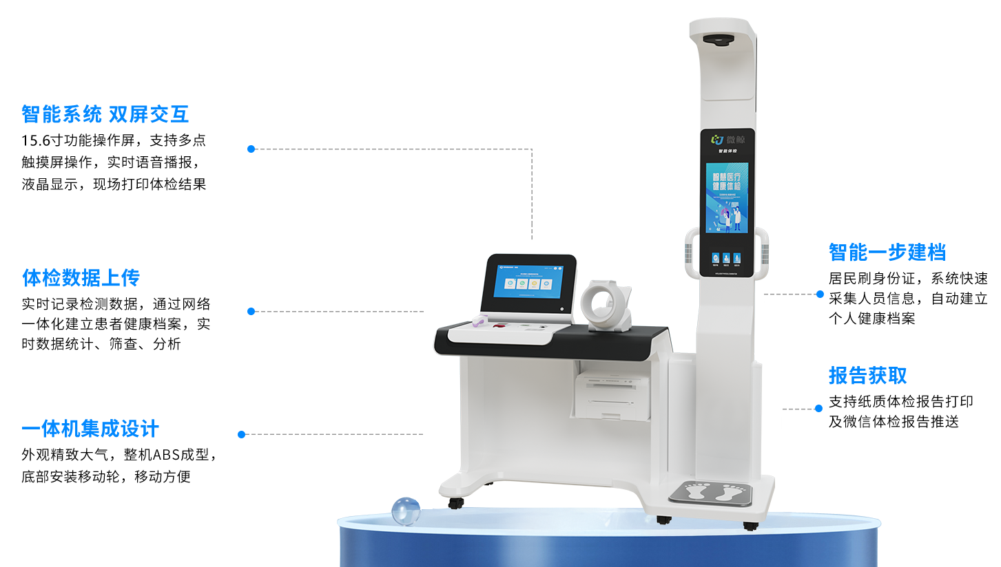 智能双屏,高度集成体检项目,一体自助测量,全程语音引导。项目满足基层公共卫生服务,实时测量并同步数据上传,同时可拓展远程诊疗等服务。